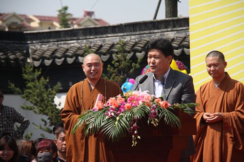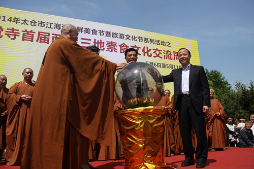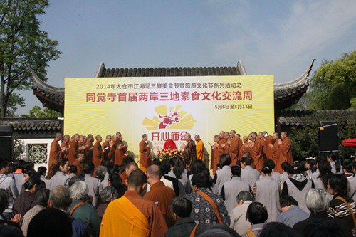 随后,同觉寺首届两岸三地素食文化交流周开幕式隆重举行,出席本次盛会的各界领导有太仓市委常委,太仓港经济开发区党工委副书记邱震德先生、太仓市政协副主席朱薇圆女士、太仓市统战部部长高扬先生、太仓市商务局局长陆定峰先生、太仓市民族宗教事务局局长包炳祥先生、太仓市浮桥镇镇长严浩先生、太仓市统战部副部长胡良先生、太仓市统战部副部长吴向阳先生、太仓市商务局副局长杨俭先生、太仓市旅游局副局长殷托先生、太仓市民族宗教事务局副局长朱文强先生、太仓市浮桥镇副镇长吴建达先生、太仓市浮桥镇统战委员龚惠琴女士、太仓市陆渡崇恩寺住持计华大和尚、太仓圣像寺住持妙法大和尚。同觉寺方丈曙提法师主持了启动仪式。
