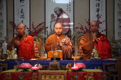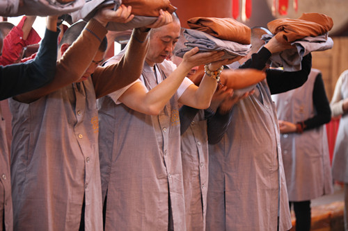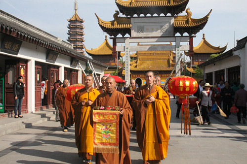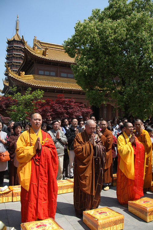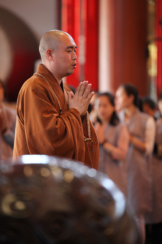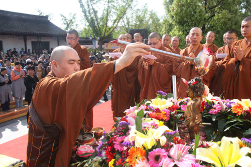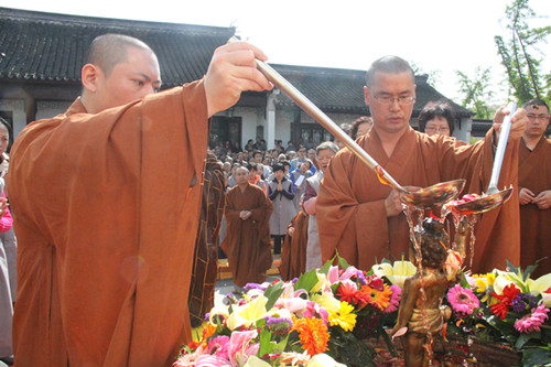 上午8时,短期出家营员和来自各地的信众一起在同觉寺真三昧素菜馆前广场隆重举行浴佛法会。浴佛法会正式开始,释迦牟尼太子金像在香花仪仗队的迎请下及梵呗清悠的庄严氛围中,由同觉寺方丈曙提法师从天王殿缓缓恭迎至浴佛现场。曙提法师缓缓庄重的将太子像恭奉于香水盆中,并亲自拈香主法。佛号声声,与会僧众及众居士在法师的引礼下礼赞佛德,井然有序的上前以香汤净水灌沐佛身,共同祈愿以佛陀的智慧法水,外涤一切尘,内除一切垢,回向法界有情远离烦恼,同证如来清净法身;共同祈祝佛日增辉,法轮常转,世界和平,国泰民安。