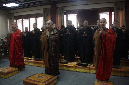 随后,在法堂举行三皈五戒法会,此次短期出家营的部分营员们在三宝座下,发菩提心、行菩萨道。曙提法师首先赞叹大家能发心皈依三宝,然后勉励大家,作为一个三宝弟子,要以佛的标准来要求自己,以佛的眼光看待身边的每一个人,、以佛的智慧和精神去生活与工作,去圆满我们的人生。对受持五戒的营员,法师慈悲开示大家受戒不但要知道不可为,更要了知有可为。