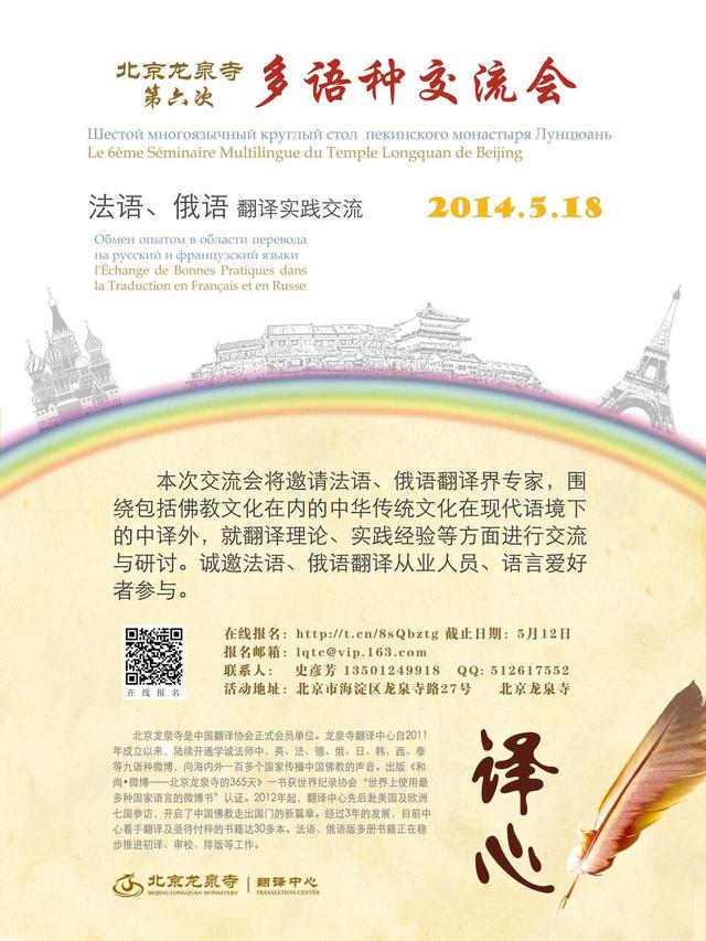 北京龙泉寺翻译中心将于2014年5月18日(周日)举办第六次多语种交流会,主题为“译心——法语、俄语翻译实践交流”。