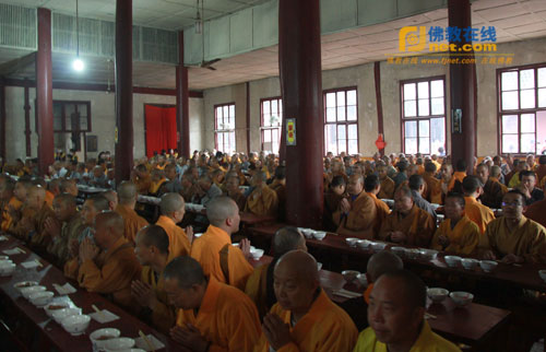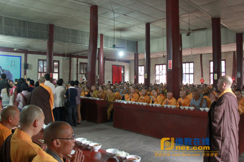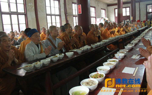 仪式开始后,来自各地的法师们合掌称诵“南无消灾延寿药师佛”圣号,有序进入昭觉寺“五观堂”,从全体站立、合掌向上问询,唱诵供斋偈诵,而后用斋,整个过程庄重而殊胜。