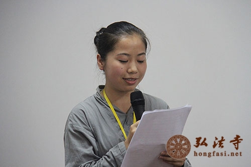 随后,陈敏师兄作为学员代表发言。她说,经过这么多天的脱产学习,她有无尽的感恩和深深的留恋。精彩的课程和法师们的风采让自己加深了对佛法的认识;集体顶礼老和尚舍利,参访老和尚纪念堂,读诵《普贤行愿品》等参学及实修课程,更加强了对本焕长老的信心,也越来越了解十大愿王的深层含义。