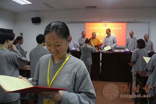 最后,在一片欢喜中,学员们从大和尚手中接下了结业证书。大家一齐祈请三宝加持,希望可以不断精进用功,发心为常住,为社会,为佛教服务。(文:南海佛教 图:顿心)