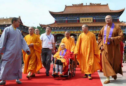 2009年90的高龄长老法驾亲临海林报恩寺殿堂落成暨全堂佛菩萨宝像开光大典(图片来源:凤凰网华人佛教)