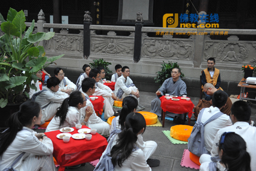 17日傍晚,在同学们对佛门礼仪及早晚功课有所了解后,弘法利生部主管庆妙法师邀请35位同学参加了一场轻松且逸趣横生的活动——品禅茶。来自文殊院禅茶社的同学为大家讲解禅茶及品茶的方法,对生活在快节奏中和被方便食品所包围的同学来说,不仅获得一杯茶水的清凉,更感受到一份“慢节奏”的禅意乐趣。