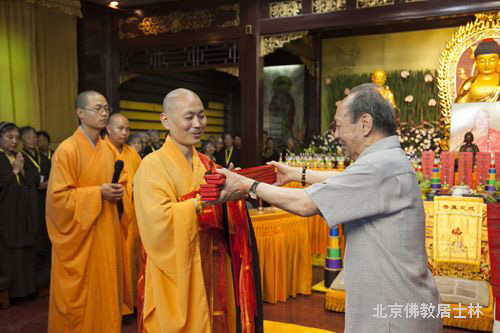 北京佛教居士林林长夏法圣代表戒道场将香板交予传戒僧团