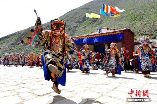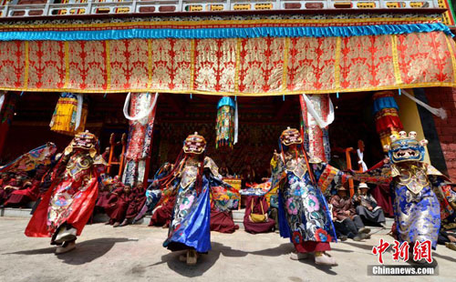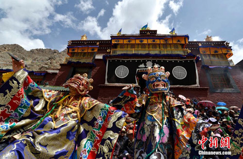 2014年6月8日,西藏藏传佛教噶玛噶举派祖寺楚布寺举行跳神仪式。当天,楚布寺僧人表演跳神。这是该寺夏季法会的主要内容之一,此外还有立经幡柱、展佛等大型宗教活动。