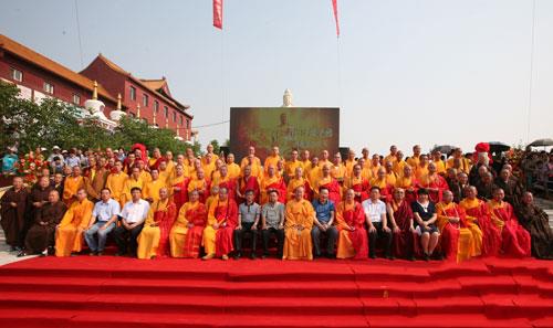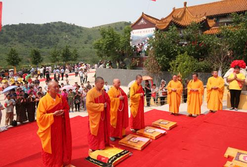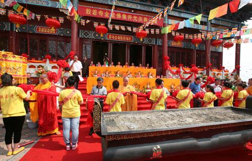 庆典结束后,开光法会由清远法师、明海法师、存海法师、代林喇嘛、果慧法师、果通法师、慧广法师、本权法师共同主法。开光仪式上,诸山长老、大德法师共同诵经祈福,主法法师拈香、说法,洒净,开光仪轨依次分“用巾拂尘”、“举镜照空”、“朱笔点眼”三个步骤,喻以佛法拂去众生心地上的垢尘,开发其内在智慧,进而遵从佛教道理,化世导俗,去除烦恼,建设和谐。