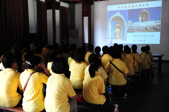 居士们首先在接待大厅聆听了有关东林寺净土苑的导览讲解,观看了《大佛胜缘记》记录片,了解了阿弥陀佛圣像的建设缘起及建设过程中的种种艰辛。大佛的建设历程和其所彰显的宗教品格令大家感动不已。