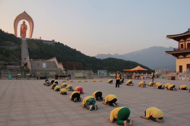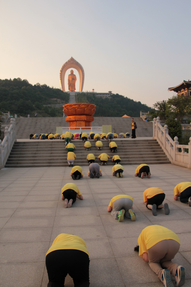 之后,居士们从信愿路起香,三步一拜至拜佛台,虔诚礼佛。随后又来到大佛台,瞻礼阿弥陀佛接引圣像,并绕佛七匝,郑重发愿:普愿天下有情皆能蒙阿弥陀佛接引,往生西方极乐世界,究竟解脱。