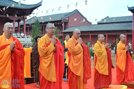 妙续法师(左一)、闻慧法师(左二)、明法法师(右一)为法会主法