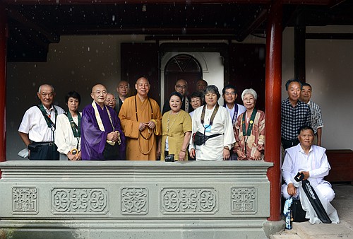 图2:本会会长道慈大和尚(前右四)接待米田会长(前右三)一行并在普济禅寺功积堂外合影