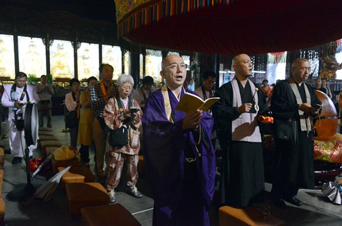 图1:日本中国观音灵场会米田会长带领朝圣团在普济禅寺圆通宝殿诵经祈福