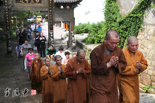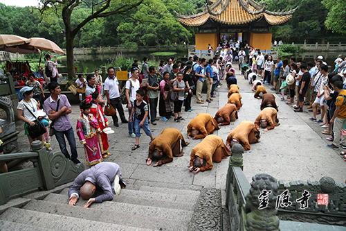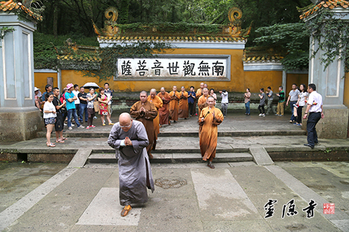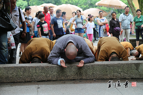 2014年7月2日上午,杭州灵隐寺方丈光泉大和尚率僧俗弟子及云林志工团义工们共50余人,怀着一颗虔诚心、感恩心,三步一拜朝拜普陀山。以虔诚的朝圣之行现身说法,再次向世人展现了四众弟子精进、正行、苦修、济生的形象。