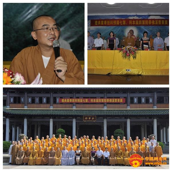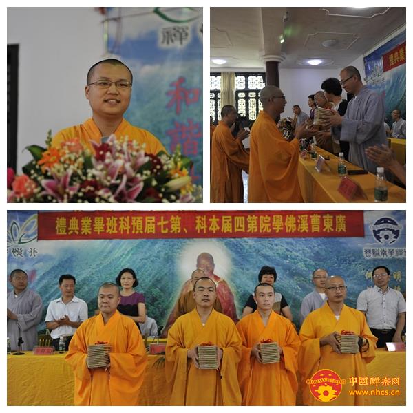 庆典在雄壮的国歌声中拉开帷幕。南华禅寺方丈、曹溪佛学院院长传正大和尚致辞。他首先代表曹溪佛学院全体师僧及南华禅寺两序大众,热烈欢迎出席庆典的领导嘉宾们。在致辞中,传正大和尚谈及曹溪佛学院的光辉历史,希望大家以近代高僧虚云老和尚、惟因老和尚为榜样,向老一辈学习,要懂得知恩图报、回馈社会。并勉励学僧不怕困难,继续努力提高个人修为,为净化社会伦理道德做贡献。最后传正大和尚还对即将赴加拿大留学的五位毕业生特别叮嘱,殷切希望他们在国外牢记爱国爱教的优良传统,将中国的禅宗文化传播到国外。