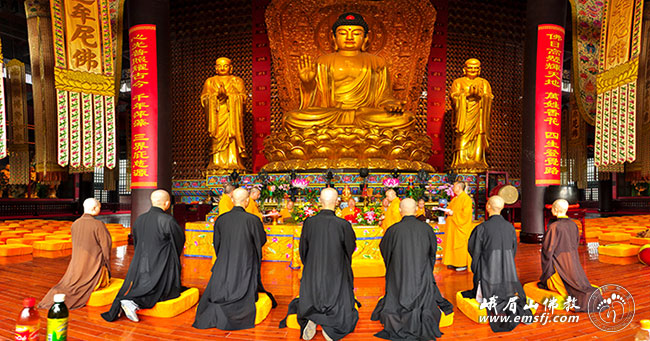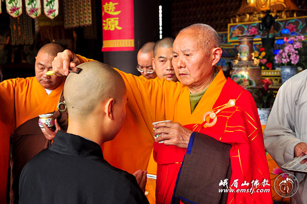 2014年7月15日,农历六月十九,恭逢观世音菩萨成道纪念日,人天同庆,诸佛欢喜。峨眉山佛教协会在峨眉山大佛禅院大雄宝殿举行庄严的拜师剃度仪式,7名考察僧经考察合格后,正式拜师、剃度,成为清净沙弥、沙弥尼。