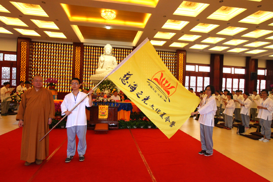 “巍巍碣石山,净宗水岩寺,弥陀宏愿普照耀,殊胜人间乐佛土。”在清凉的《梦醒水岩》夏令营营歌歌声中,存海法师将营旗授予营员代表手中。最后,全体人员在水岩寺山门前合影留念。