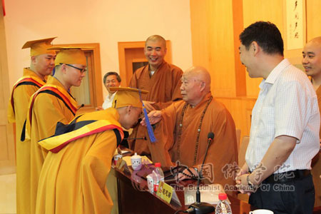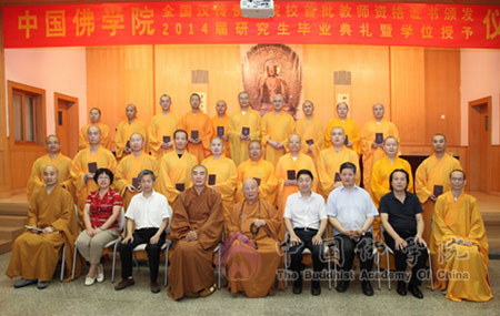 为推进中国佛教教育发展,规范佛教院校管理,加强佛教院教师队伍建设,提高教师素质和教育教学水平,根据国家宗教局宗教院校《宗教院校教师资格认定和职称评审聘任办法(试行)》和《宗教院校学位授予办法(试行)》(以下简称《两个办法》)的相关规定和要求,2014年7月19日下午,中国佛教协会教育委员会在中国佛学院大礼堂举行了中国佛学院首批教师资格证书及学位授予资格证书颁发仪式。
