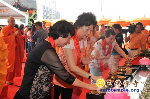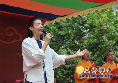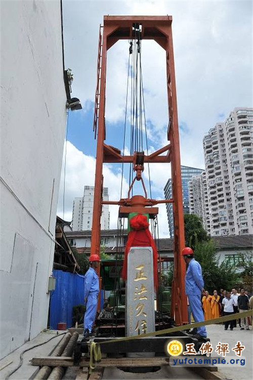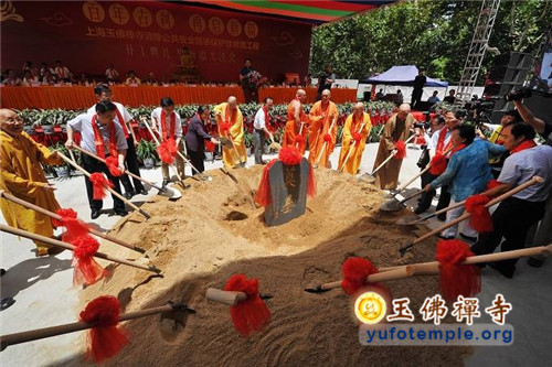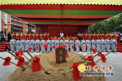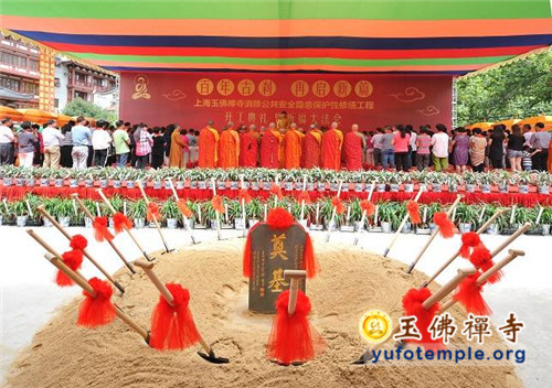 开工典礼上,特邀青年歌手霍尊演唱了由觉醒大和尚作词、著名音乐人安栋谱曲的、专门为玉佛禅寺保护性修缮工程而创作的歌曲《玉佛传灯》。到会的嘉宾代表还为工程剪彩,并奠基培土。开工典礼最后在上海市第十三届人大副主任、玉佛禅寺修缮工程委员会主任胡炜先生启动工程打桩的仪式中达到了高潮。真诚祈愿玉佛禅寺的消除安全隐患工程能修缮顺畅,古刹重光,法缘继兴,功德圆满!