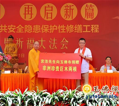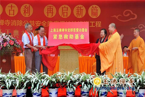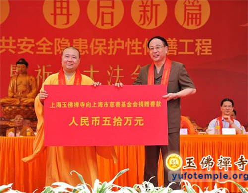 为了表达对寺院工作的支持,在开工典礼上,有两位居士在现场分别向寺院捐赠砗磲佛像和非洲珍贵巨木。寺院方也在典礼上由觉醒大和尚和市老领导陈铁迪、龚学平、刘云耕等为“上海玉佛禅寺觉群慈爱功德会紧急救助基金”揭牌,同时觉醒大和尚代表寺院向市慈善基金会捐赠人民币50万元,市慈善基金会会长冯国勤先生接受捐赠。这表达了寺院遵从佛教慈悲济世、利乐有情的决心和态度,不会因为工程受影响,将一如既往地继续关心社会弱势群体,扶危济困、救难助贫。
