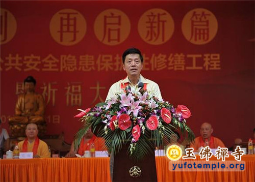 接下来在居士代表和诸山长老代表的发言中,对玉佛禅寺消除安全隐患的修缮工程都给予积极肯定和热情的支持。随后上海市普陀区委常委、区统战部长黄海平和中国佛教协会张琳副秘书长分别代表区政府和中国佛教协会发言,对玉佛禅寺的消除安全隐患工程表示积极的支持,并希望寺院做好工程建设与继续保持对外开放之间的工作,保证安全,满足信徒宗教生活的需求,继续做好和谐寺观教堂的创建和文明宗教场所的建设工作。张琳副秘书长还向寺院转赠了中国佛教协会会长传印长老专门为寺院工程的题词墨宝——“玉佛百年,再启新篇”。