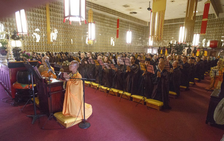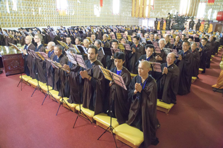 美国万佛圣城于2014年8月5日下午2时传授六重二十八轻在家菩萨戒,仪式非常庄严隆重,在钟鼓齐鸣中,戒子们至诚恳切地迎请恒律法师、恒山法师、近永法师主持传戒法会,共有207位戒子圆满受戒。