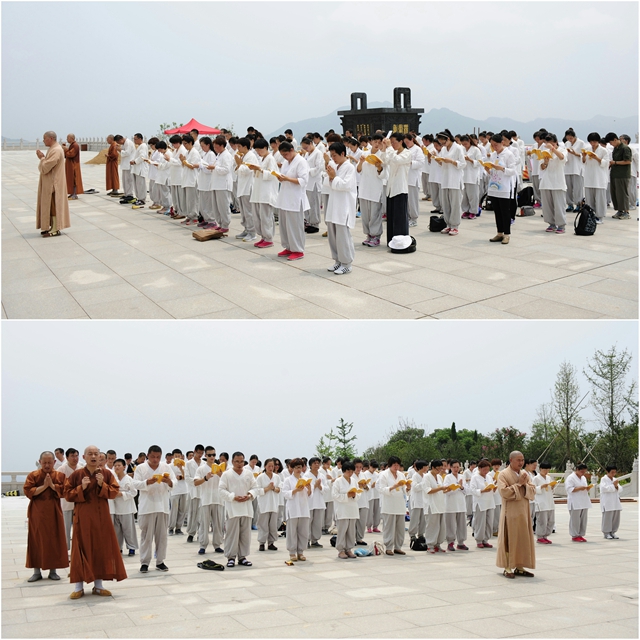 8月7日正午,来自禅宗古刹,黄梅老祖寺的当家师崇延法师,率缁白二众90余人,前来净土苑朝礼东林大佛。 崇延法师一行整齐列队,伴随着法器声,高声念诵弥陀圣号,步行至大佛台。四众弟子在阿弥陀佛圣像前诵经、发愿、回向,并绕须弥台三周。虽然正午烈日当空,汗如雨下,但大家仍踊跃欢喜,纷纷在大佛脚下合影留念。临别前,几位居士遥指须弥台矗立的弥陀圣像,欣然道:“这就是我们未来的样子……”。慈悲喜舍,金色相好,信切愿真,期生净土。 据带队的倪居士介绍,随行人员中除出家师父外,在家居士均是参加老祖寺暑期“生活禅”夏令营的营员,并且大都已皈依受戒。此次自老祖寺到净土苑,并朝礼东林大佛,是夏令营活动安排中的重要一项。居士们大都来自河北,职业以教师为主,大多数人都是初次现场瞻仰大佛圣容。 随着净土苑建设的日臻完善,凝聚着十方檀信真心切愿而铸成的东林大佛,也显露出越来越广泛的影响力。