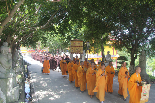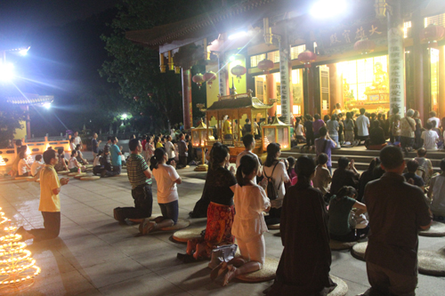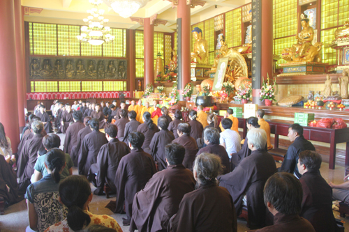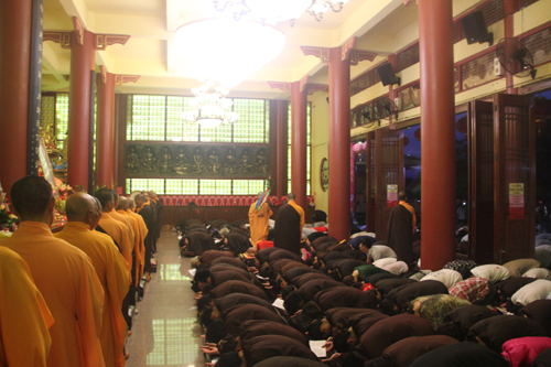 晚18时整,石室禅院内钟鼓齐鸣,四众弟子整齐列队,在地藏菩萨圣号声中缓步向抄经堂行进,一起恭请忠明法师至大雄宝殿主持地藏菩萨昼夜精进七圆满回向灌顶加持法会。仗此七昼夜不间断念诵地藏菩萨圣号的功德回向个人堂上历代祖先、怨亲债主,横死孤魂等众离苦得乐,早生净土!同时祈愿灾历不起、国泰民安、风调雨顺!