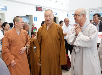 中国佛教协会国际部主任普正法师、寺院工作办公室主任清远法师接机(图片来源:黄梅五祖寺 摄影:路鹏杰)