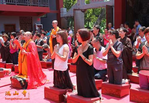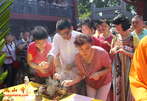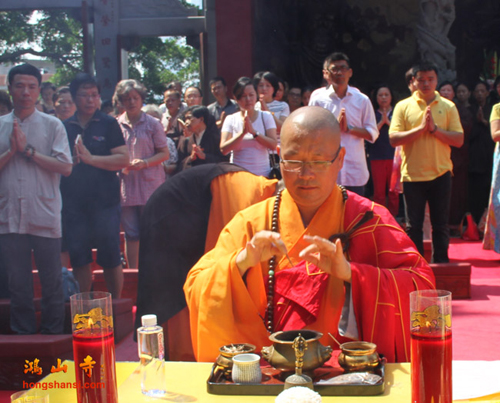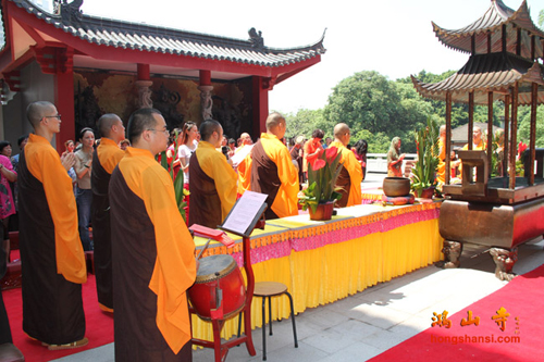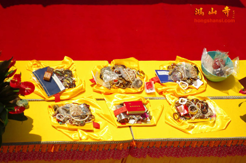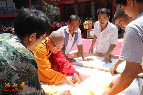 2014年8月25日上午10点,鸿山寺在新寺院隆重迎请四十一尊玉佛圣像,三宝佛、千手观音、文殊、普贤、三十三观音及阿难、迦叶,并为圣像举行装藏仪式。鸿山寺住持法云法师亲自主法。护法善信热情踊跃,以诸珍宝供奉圣像,庄严道场。同沐佛恩,共沾法喜。