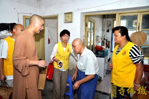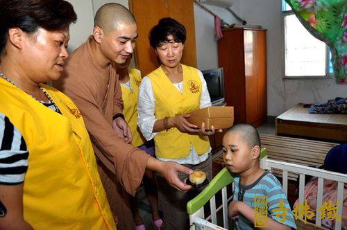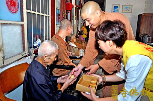 月到中秋分外明,每逢佳节倍思亲。一年一度的传统佳节——中秋节即将来临,铁佛寺每年都在中秋节即将来临之际,给社会需要关爱的人送去一份爱的祝福。2014年9月2日,铁佛寺普觉慈爱义工带着铁佛寺的净素月饼慰问敬老院老人、儿童和残障人士,再次展现了佛教义工走入社会,以“人间佛教”的慈悲精神,传递社会正能量。