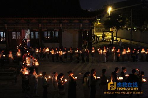 晚19时30分,观音寺内祥风阵阵,四众弟子云集。祖定法师带领四众弟子宣读传灯祈愿文。随后,六盘水市佛教协会副会长兼秘书长、灵山寺当家果清法师代众祈请法师点燃莲灯,大众手捧莲灯,持念“南无本师释迦牟尼佛”,有序的绕观音寺一匝至天王殿前摆放成“佛日增辉,正法久住”八个字,现场气氛祥和,盛况空前。