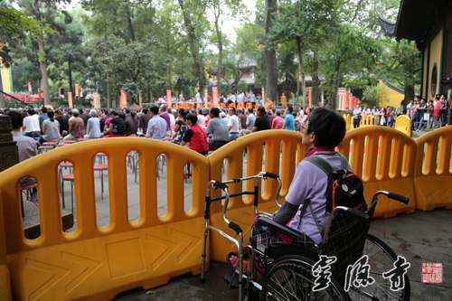 一位坐在轮椅上的游客在场外听经