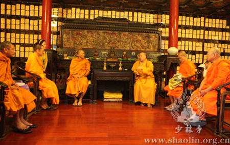 2014年9月23日下午16点,泰国副僧王帕蓬迪乐(Phra promdilok)法师一行20余人,在少林寺延耘法师的陪同下,到少林寺方丈室会谈,受到永信法师的诚挚接待。