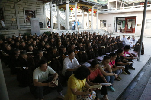 下午三点三十分,缅怀老和尚追思法会正式开始。定光寺现任方丈达仪大和尚,定光寺监院、广东尼众佛学院现任院长达理法师,以及寺院全体常住僧众、广东尼众佛学院全体师生、护法居士等三百多人,云集在定光寺“宏慧老和尚纪念馆”前。法会最初,以一首清净悠扬的《炉香赞》,让四众弟子们回想起老和尚生前对寺院、佛学院的种种奉献,法会同时,大家还一起虔诚恭诵了老和尚生前最喜爱的《金刚经》!