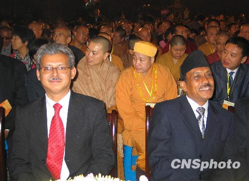 “净心慈恩、盛世长安”长安佛教学术研讨会二十七日晚间在西安大慈恩寺开幕。 来自印度、尼泊尔等国驻华使节、中国名山名寺的著名高僧大德及佛教研究方面专家学者等三百余人参加。图为尼泊尔驻华大使坦卡·普拉萨德·卡尔基(前排右)、印度驻华公使杰迪布·马宗达在开幕式上。 中新社发 冽玮 摄