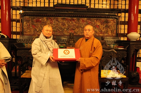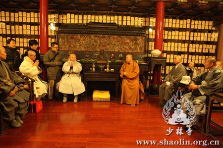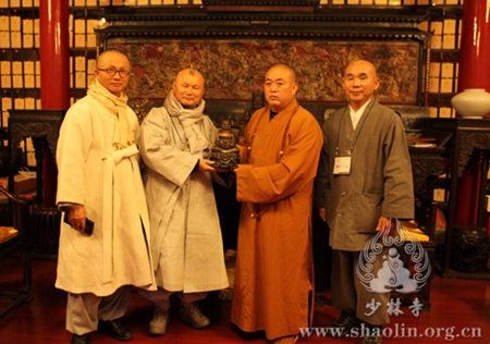 与真和法师同行的法师们还踊跃地向永信法师了解有关少林文化在国际上的发展状况,还特地向永信法师在英国伦敦举办的“第三届少林文化节”表示祝贺。
