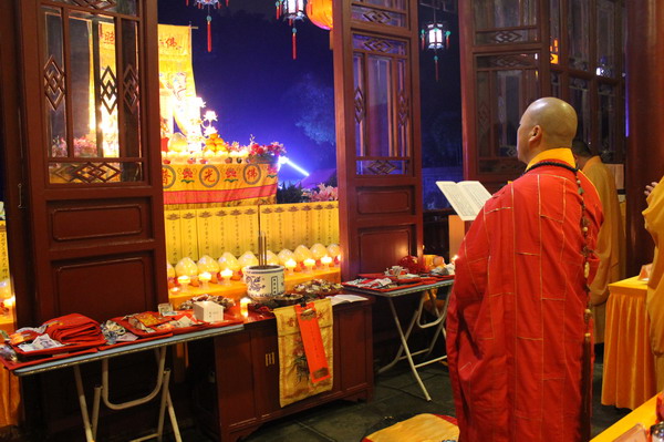 2014年11月11日(农历闰九月十九)凌晨,江苏省南京清凉寺举行了一年一度的众姓供佛、斋天法会,感恩十方三宝、诸天护法,祈愿祖庭兴盛、海众安和。坛场敬设二十四诸天牌位以及诸天供桌,恭敬迎请礼拜佛、菩萨、声闻缘觉、历代祖师圣众;祭祀法界诸天、大梵天、帝释天、护世四天王、金刚密迹、散脂大将、天龙八部、名山大川等一切神祗。百余信众随缘参与,身心庄严,法喜充满。
