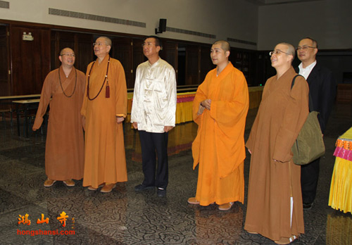 净耀法师一行在观音殿上香。在参观鸿山讲堂时,净耀法师关心在筹备中的鸿山图书馆,表示将捐赠一批图书,帮助完善图书馆建设。随后参观了试营业中的菩提斋素食馆,并在会客室座谈交流。