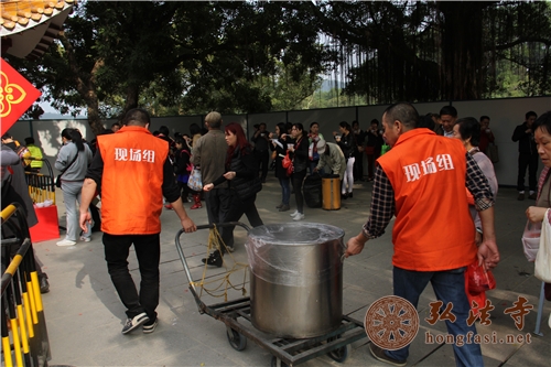 今年弘法寺于深圳地区设立3个施粥点:弘法寺、莲塘街道办施粥处、东湖公园万佛禅寺,先后施粥十万余碗。每年这个时候,弘法寺斋堂的师父和义工们最忙的时候,为了保证粥的质量,斋堂的师父和义工们都是提前几天就开始挑制熬粥的原料。依循传统,腊八粥由斋堂法师亲自调整各种原料比例。据了解,今年的腊八粥采用香米、莲子、桂圆、红豆、花生、核桃、大豆、薏仁、红枣、等食材,精心熬制,寓意着吉祥如意、增福增寿。