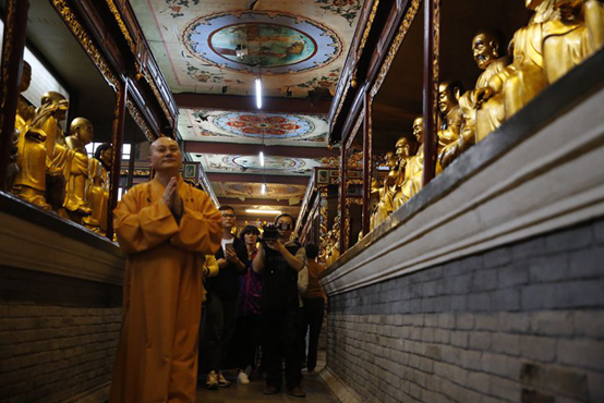 17日下午,传喜法师一行来到位于广州荔枝湾闹市区的华林寺朝拜祖庭华林寺。华林寺是达摩祖师的西来初地,当时名为“西来庵”,是祖师传佛心印的第一道场。华林寺内主要供奉的是达摩祖师和五百罗汉,殿内有多幅对联说法,墙上雕刻的壁画内容叙述了祖师“面壁九年”,“一苇渡江”,“只履归西”等典故,忆念祖师弘法的悲愿,启迪众生蒙昧的心智。