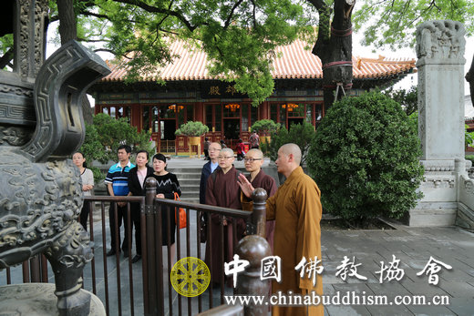 上午9时30分许,性月法师一行抵达中国佛教协会所在地——北京广济寺,性月法师一行首先参观了广济寺,并在大雄宝殿内礼佛诵经。随后,学诚法师在广济寺小客厅亲切会见了性月法师一行,双方进行了座谈交流。会见中,性月法师一行对学诚法师的热情接待表示感谢,向中国佛教协会第九次全国代表会议的胜利召开表示热烈祝贺,并向学诚法师介绍了台湾灵鹫山佛教的有关情况。