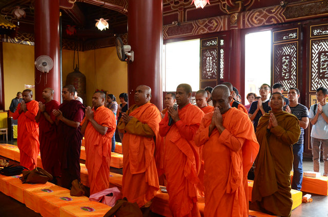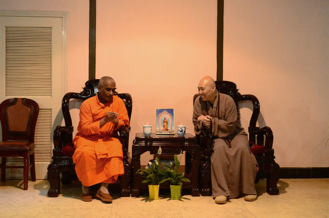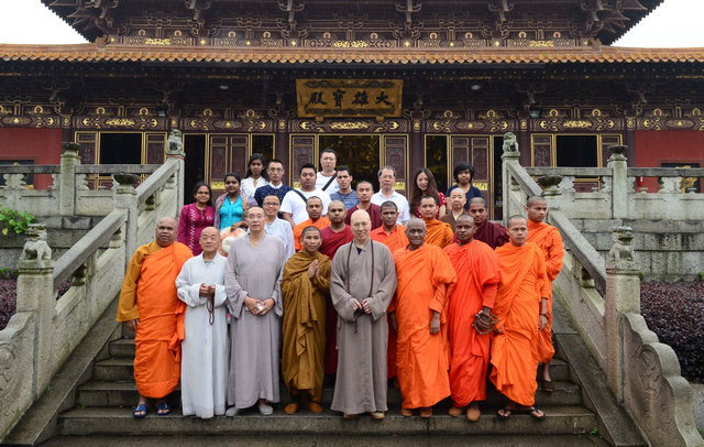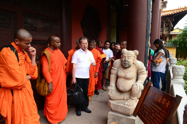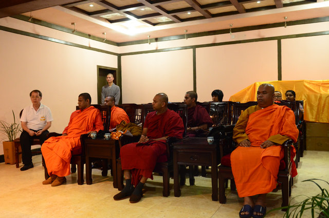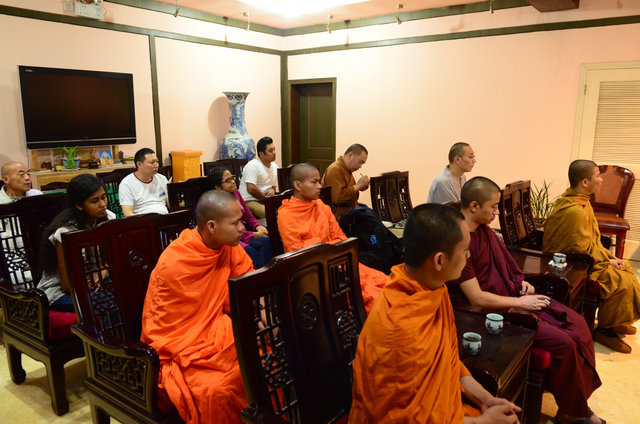 南传佛教的比丘参加东林寺僧众的午斋 体验汉传佛教寺院的过堂礼仪 大安法师为来访的客人介绍净土法门 穿白T恤的居士负责翻译 客人聆听 提问 大安法师回答 客人谈拜东林大佛的感受 大安法师赠送客人《白莲社十八高贤图》 大雄宝殿前合影 客人一行在大雄宝殿内用巴利文诵经 礼佛 东林寺知客师向客人介绍六朝松 介绍出木池 介绍护法力士的来历 客人参观聪明泉 用聪明泉沐手 现场品尝聪明泉 品尝聪明泉 用瓶子灌装 参礼佛驮跋陀罗尊者塔 寺院给客人结缘了净土法宝