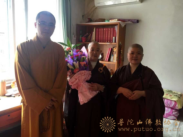 普陀山佛协委派常慈法师一行慰问常乐禅院新定长老尼(中)