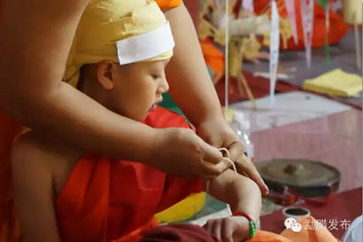 得到允许后,众僧人在家长的帮助下,给新出家的男孩们换上袈裟,戴上佛珠,男孩们正式成为和尚。
