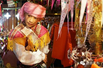 更衣后的男孩就像华丽变身一般,变成一个珠光宝气、漂亮可爱的傣族小王子。男孩盛装打扮后,端坐在中央,默默静待着亲人们的祝福。