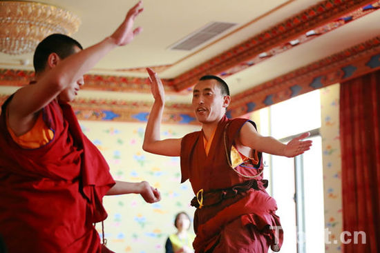 5月8日上午,藏传佛教第二届中级学衔辩经考试在中国藏语系高级佛学院举行。图为辩经现场。摄影:许娜