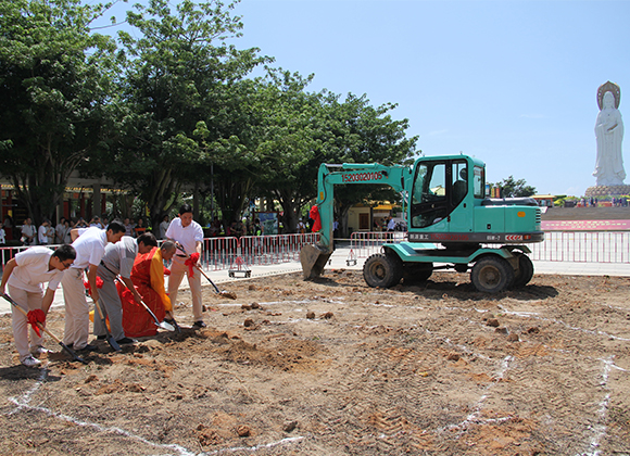 法会仪式后,海南三亚南山功德基金会副秘书长吴元杰与法师一起进行动土仪式,并在新址前合影留念。
