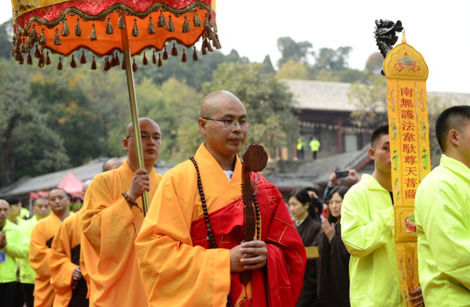 仪仗队引领法师至山门