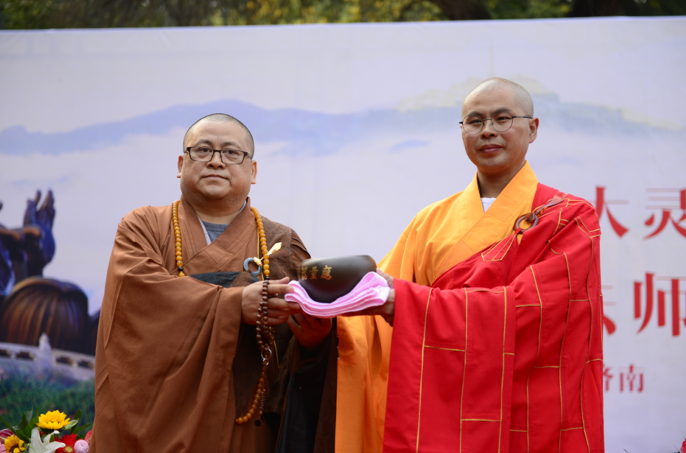 佛门盛事,因缘殊胜。上午九时许,弘恩法师法驾至山门广场,诸师大众两序云集,合十恭迎。山东省佛教协会副会长、青州广福寺方丈本悟法师送衣,北京市佛教协会常务理事、北京药师寺方丈性然法师送钵,山东省佛教协会副会长、烟台龙口南山禅寺方丈真龙法师送挂珠,青岛市灵珠山菩提寺住持妙智法师送拂尘,青州市龙兴寺住持妙严法师送具,临沂市兰陵县灵峰寺住持慧悟法师送龙杖,枣庄市峄城区青檀寺住持心安法师送锡杖,济宁汶上宝相寺住持正德法师送如意。